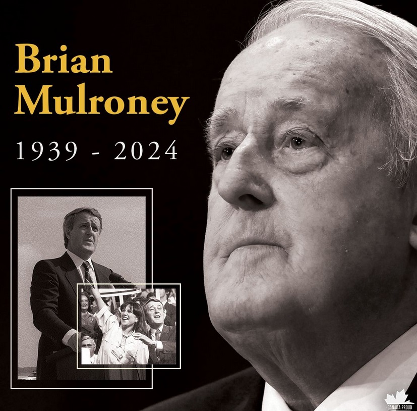 « Au nom de ma mère et de notre famille, c'est avec une grande tristesse que nous annonçons le décès de mon père, le très honorable Brian Mulroney, le 18ème premier ministre du Canada. Il est mort paisiblement, entouré de sa famille.