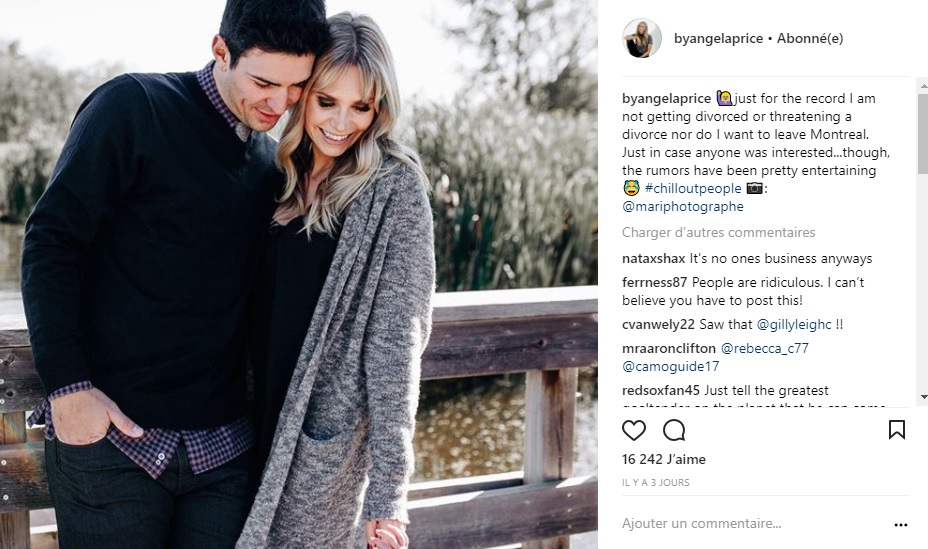 Le célèbre joueur de hockey Carey Price a énormément fait parler de lui dans les derniers jours, et ce n'était pas forcément dans le bon sens. Sa femme a d'ailleurs dû publier un message sur son compte Instagram pour démentir les rumeurs comme quoi elle obligeait son mari à quitter Montréal, sinon c'était le divorce: