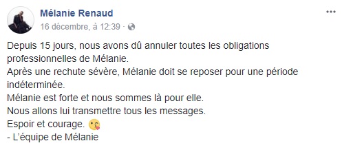 La chanteuse Mélanie Renaud a vécu des moments difficiles dans les dernières années: Elle a dû combattre un cancer des ovaires, et a traversé des problèmes de dépendance. Sur le plateau de Tout le monde en parle, elle disait qu'elle allait mieux, mais récemment, son équipe a publié ce message troublant sur sa page Facebook:
