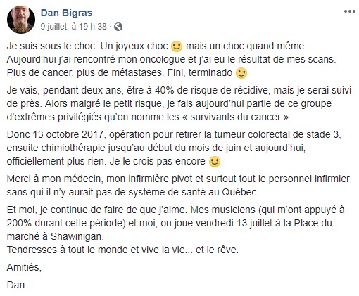 Les nouvelles de Dan Bigras sur son cancer sont très encourageantes!