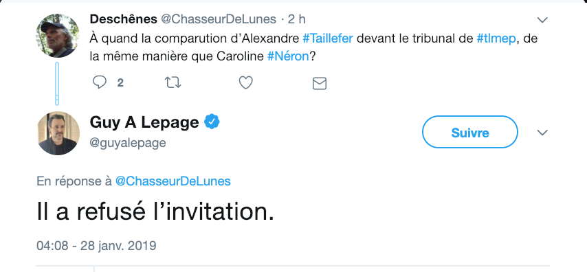 « Alexandre Taillefer c'est l'exemple parfait du "funny baloney" qui se pavane dans tout les médias quand ça va bien... mais se cache comme une coquerelle quand ça va mal... #teotaxi #polqc #polcan #tlmep »