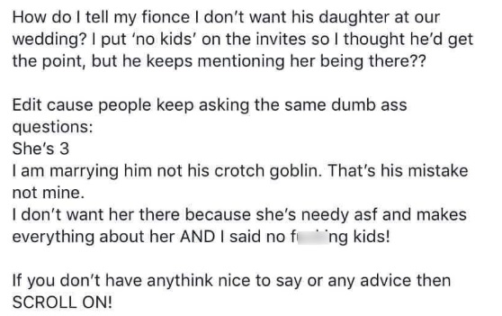 C'est un utilisateur sur Facebook qui a partagé un texte qu'il a trouvé, complètement abasourdi. Et on l'était aussi quand on l'a lu. Les personnes les plus importantes dans la vie d'un parent sont certainement ses enfants, et une future Bridezilla ne voit pas la présence de la fillette de 3 ans de son fiancé d'un bon oeil le jour de son mariage.